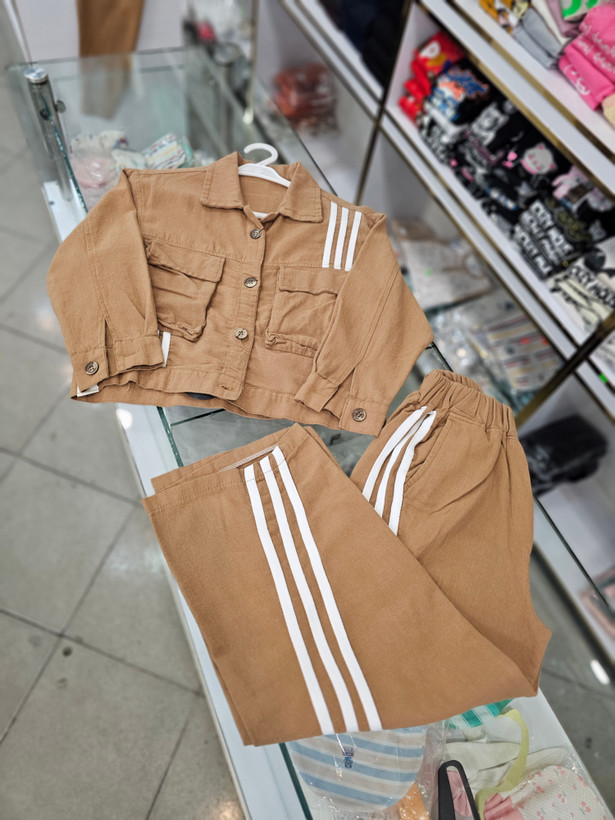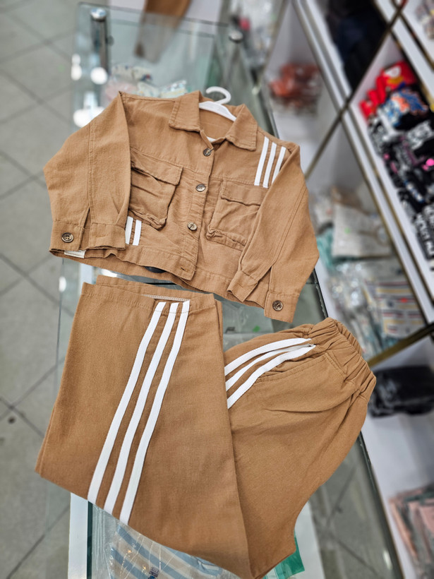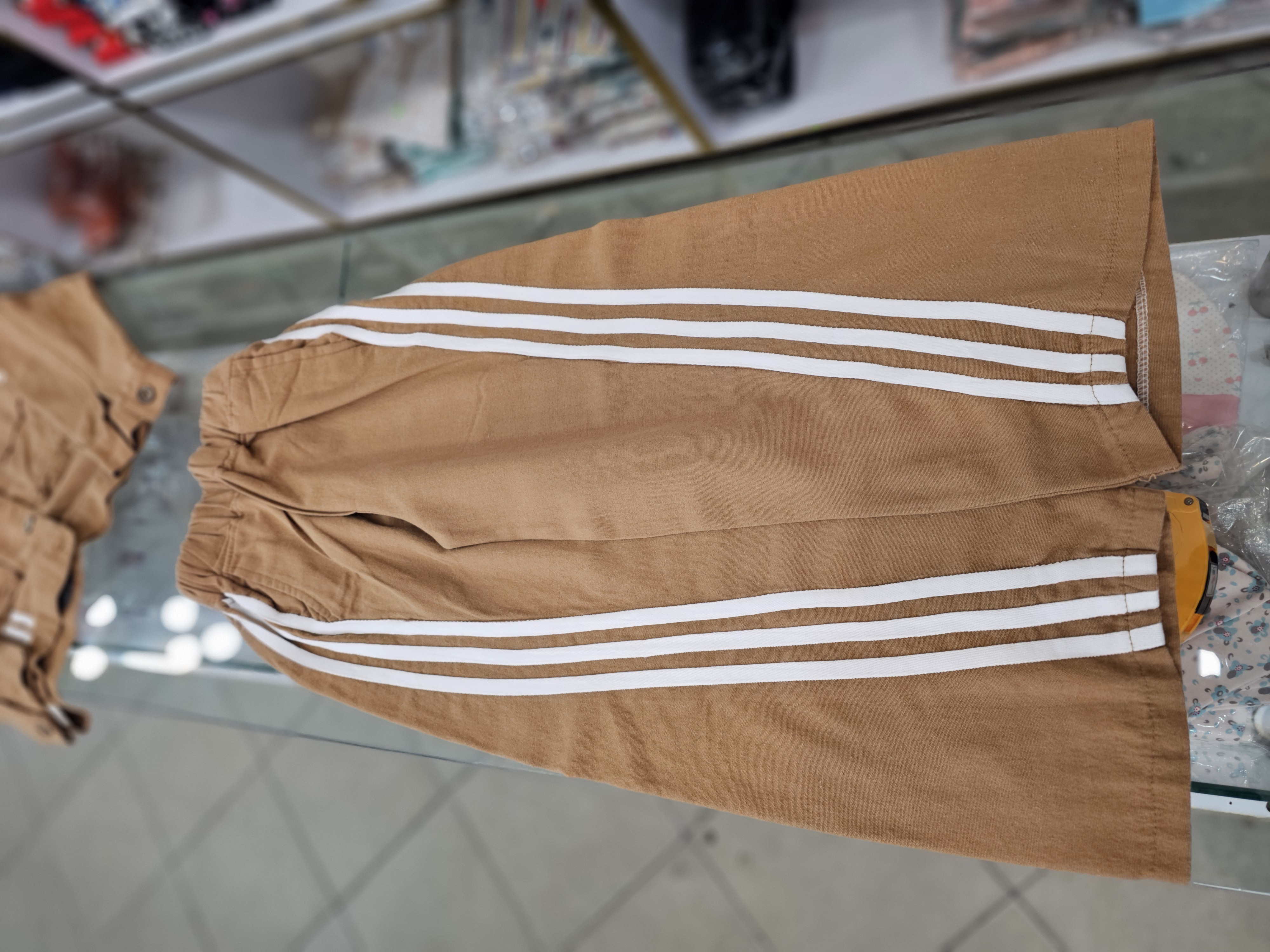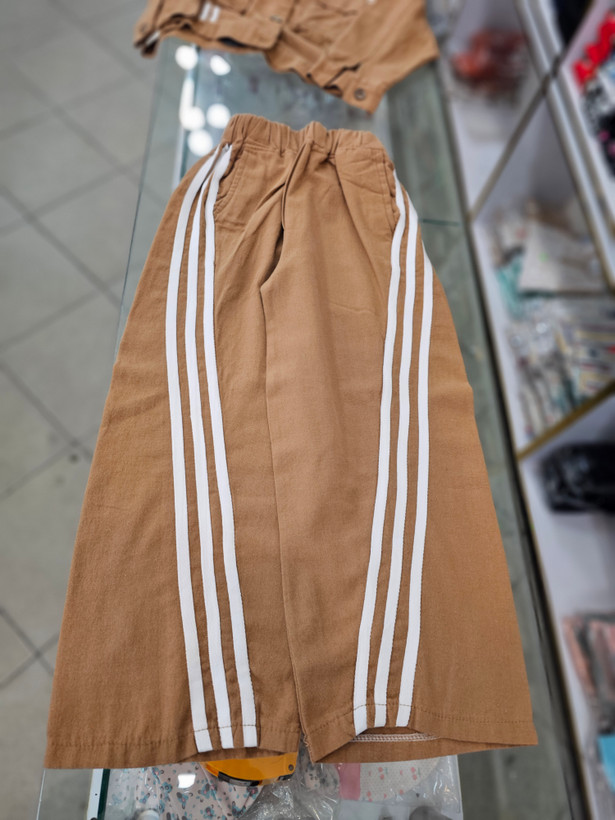 کت شلوار کتان لنین دخترانه نوار دار مناسب ۶ تا۸ سال با شلوار بگ