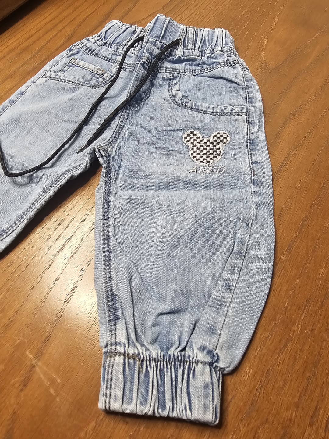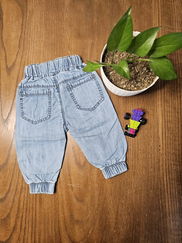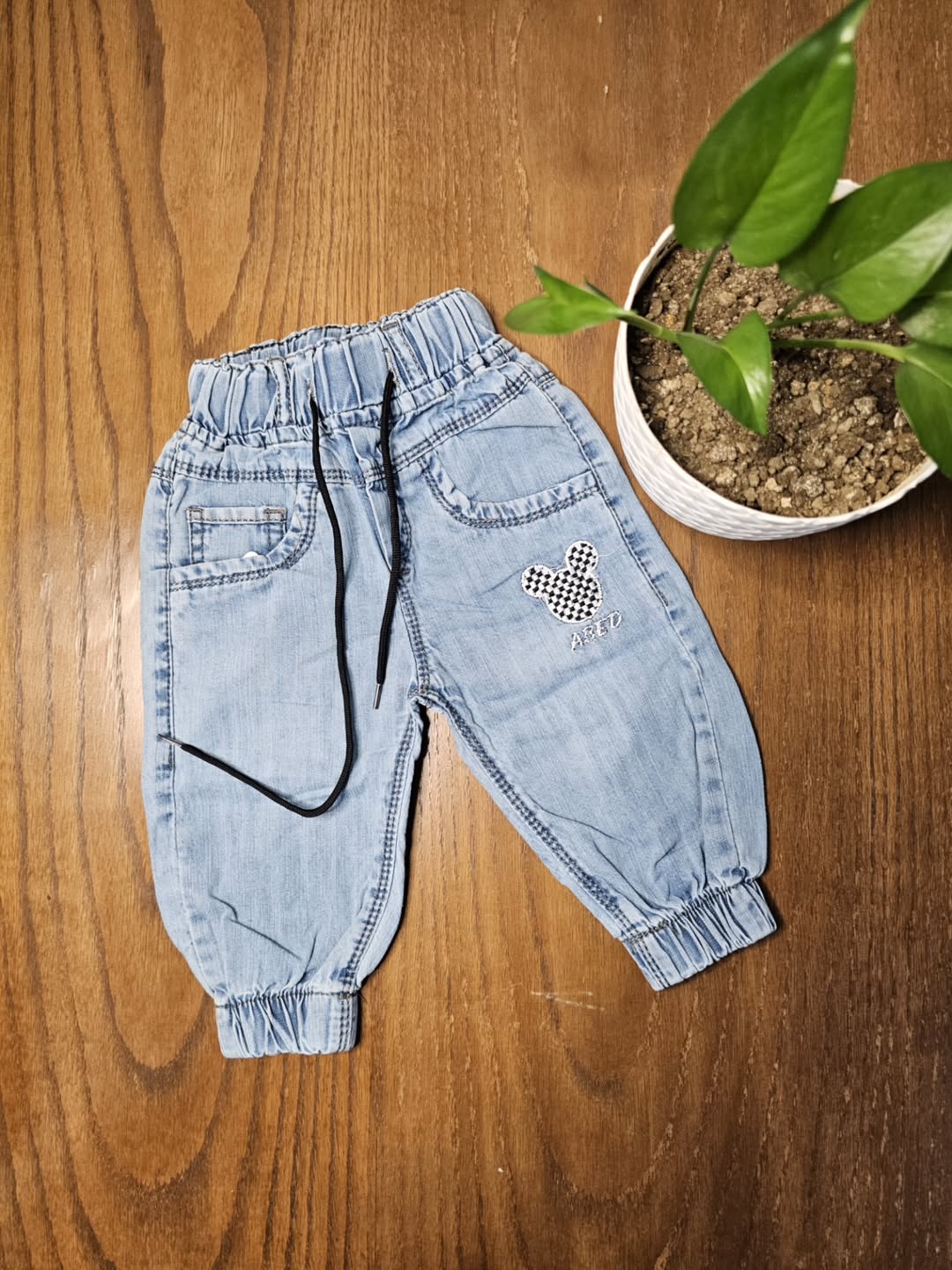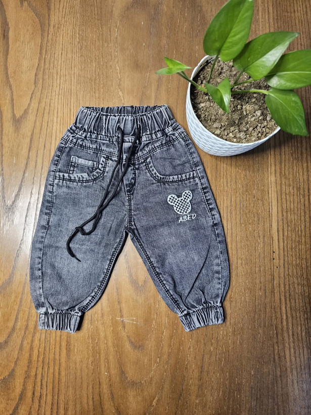 شلوار لی نقلی مدل میکی دمپا کش و بسیار راحت پارچه لی کاغذی مناسب ۲۴ماه رنگ ذغالی و آبی روشن.