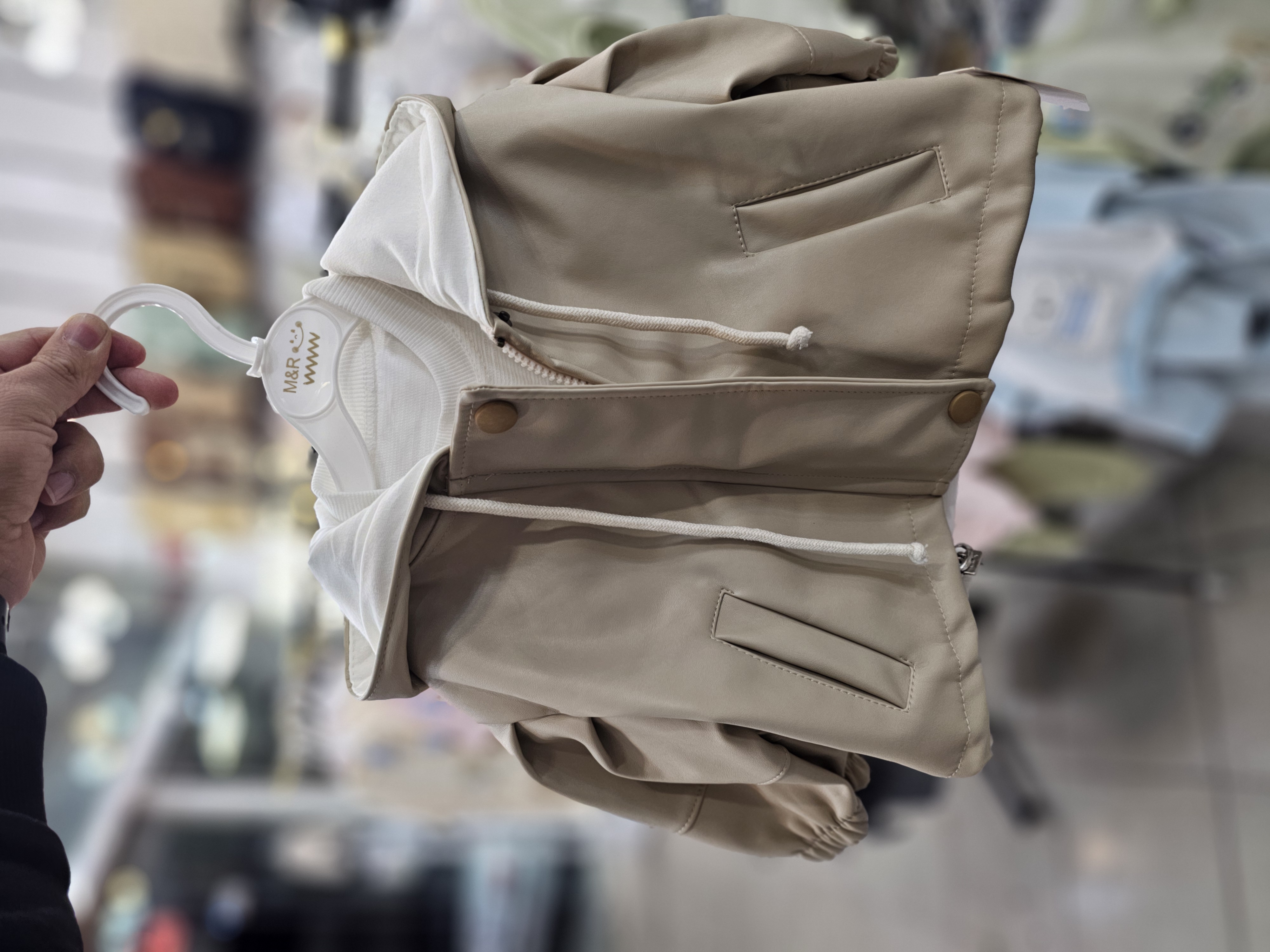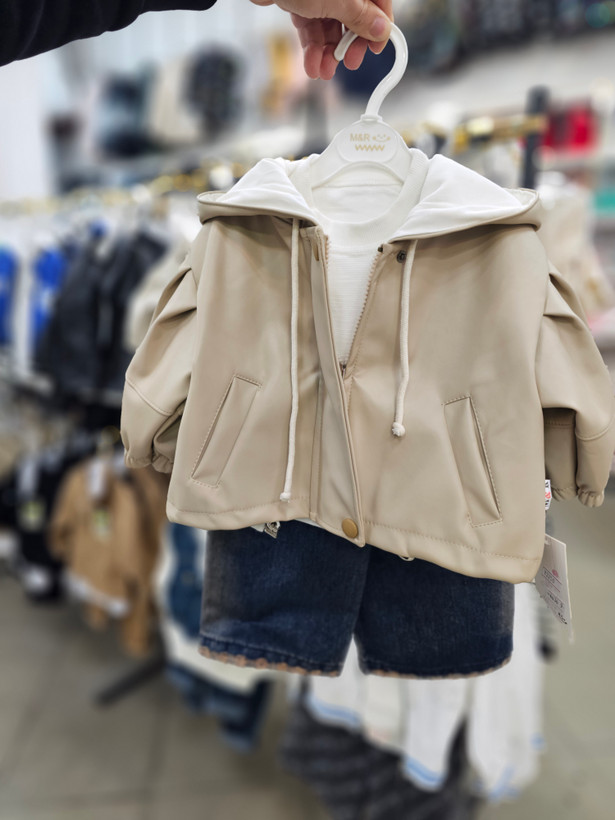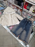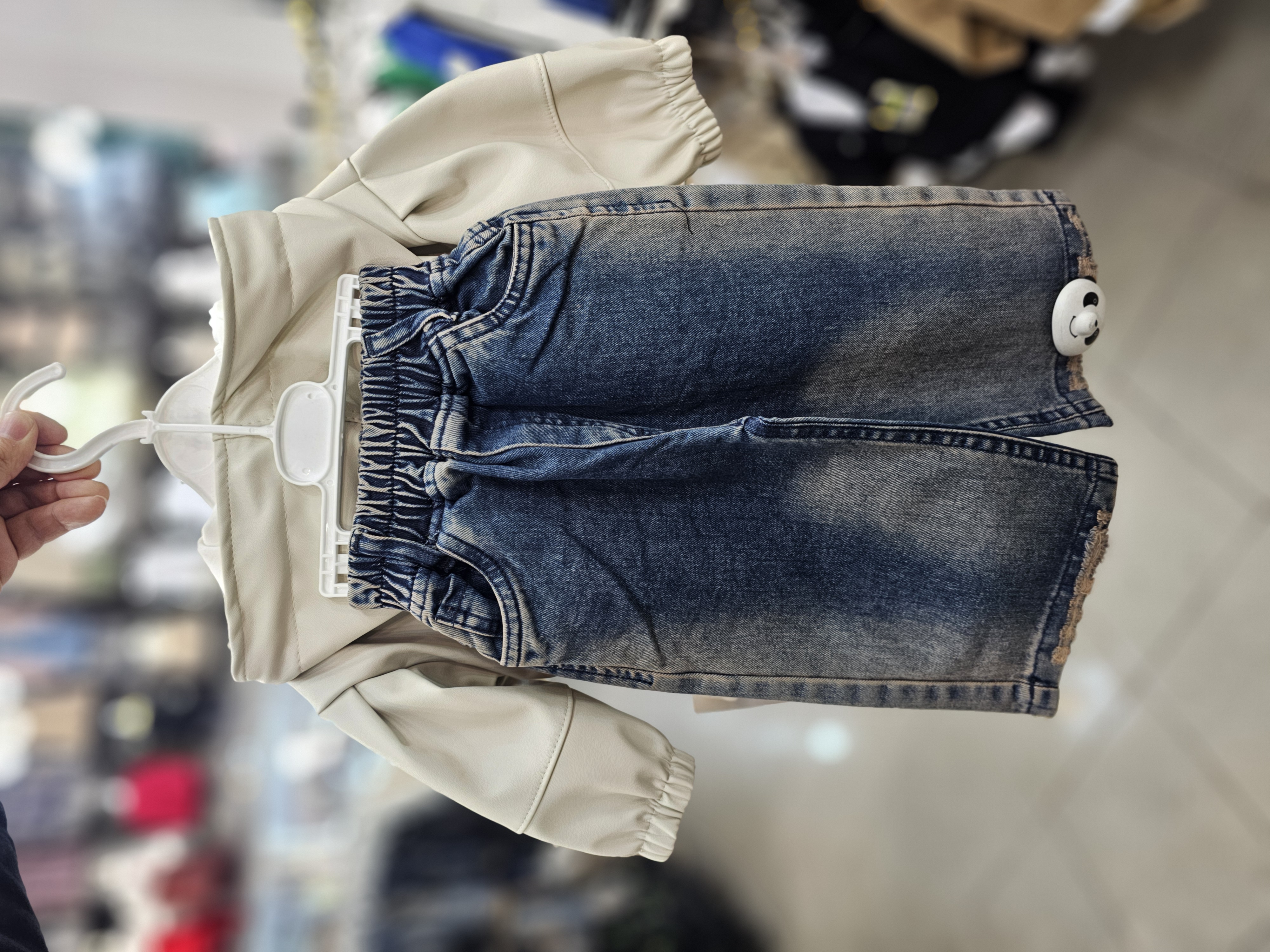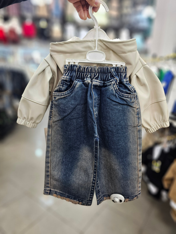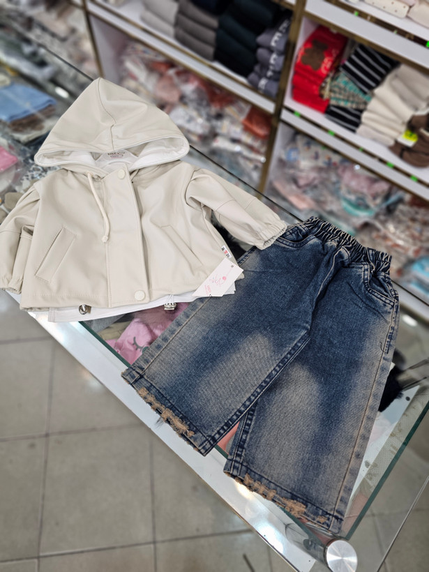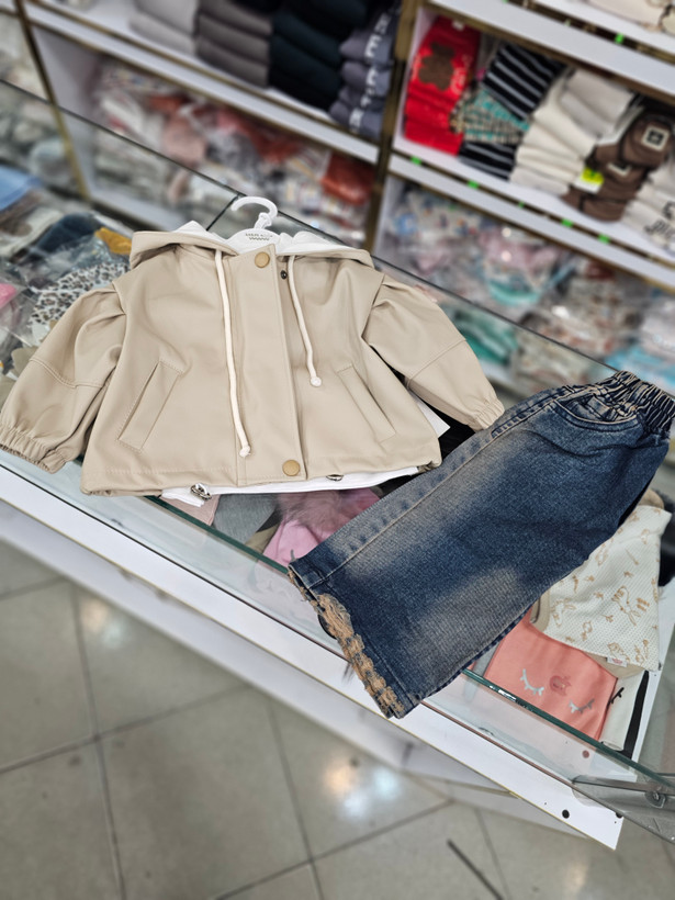 ست کت کلاه دار چرم با شلوار لی و بلوز آستین بلند پارچه ترک تضمینی مناسب ۹ ماه تا۴ سال