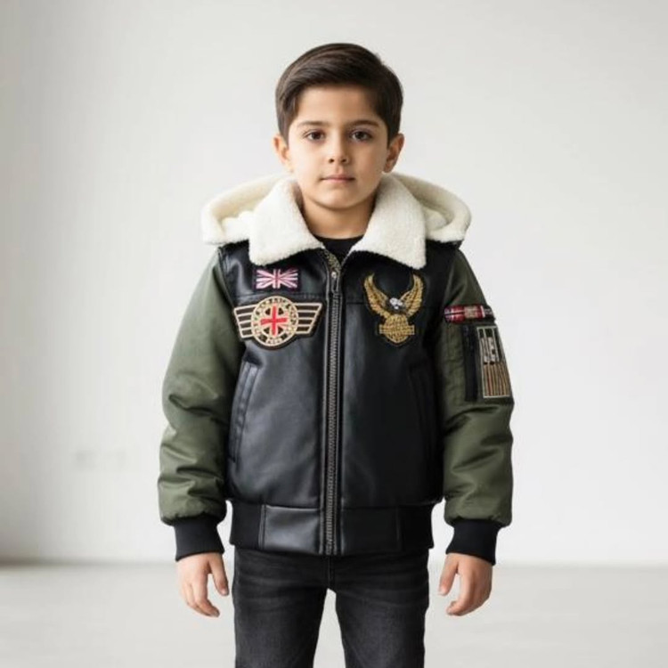 کاپشن چرم کلاه دار داخل خز مخصوص زمستان سایزبندی۲تا ۱۰ سال