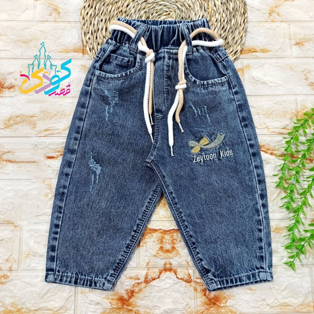 شلوار مام دخترانه از جنس جین پنبه بدون کش، مناسب برای سنین ۶ ماه تا ۳ سال.