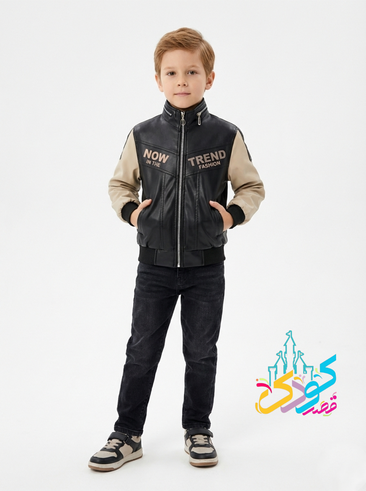 ناموجودکت چرم اسپرت آستین زیپ دو رنگ سایز ۳ تا ۱۲ سال